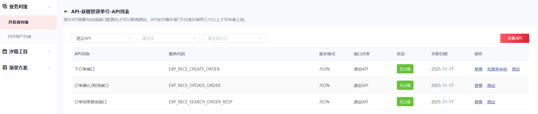3. 申请两个接口:速运API:下订单接口,EXP_RECE_CREATE_ORDER,订单结果查询接口 EXP_RECE_SEARCH_ORDER_RESP,订单取消接口 EXP_RECE_UPDATE_ORDER(非必须)